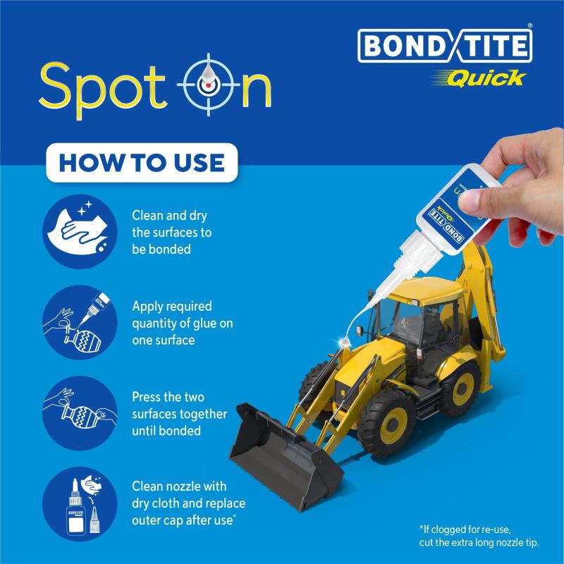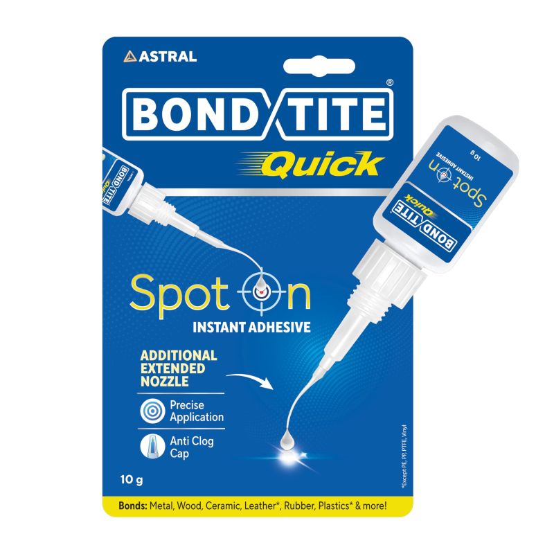 Package Contents – Bondtite Quick Spot-On All-Purpose Instant Adhesive: high-precision glue with extended nozzle and anti-clog cap, fast setting and versatile use, 2x10g tubes.