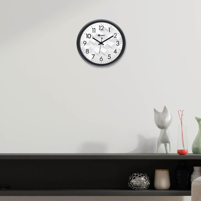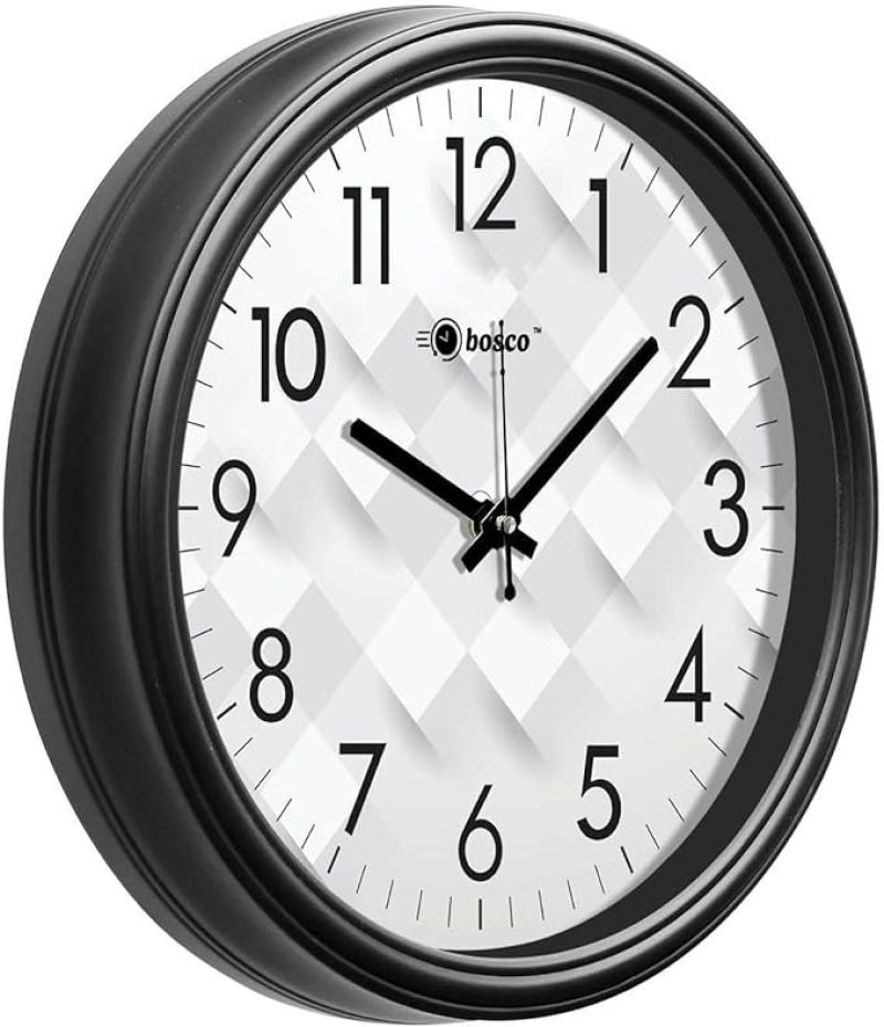 Bosco Modern Non Ticking Silent, Black Frame with White Face 30 CM, Round Wall Clock for Home, Living Room, Bedroom, Office and Kitchen