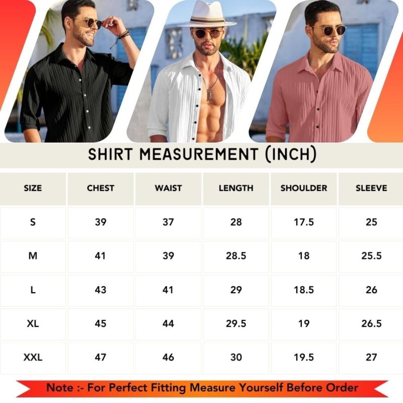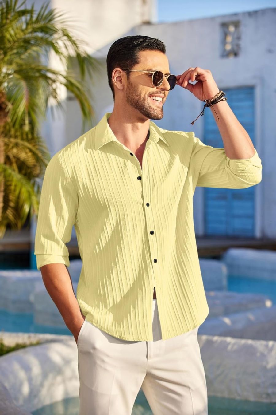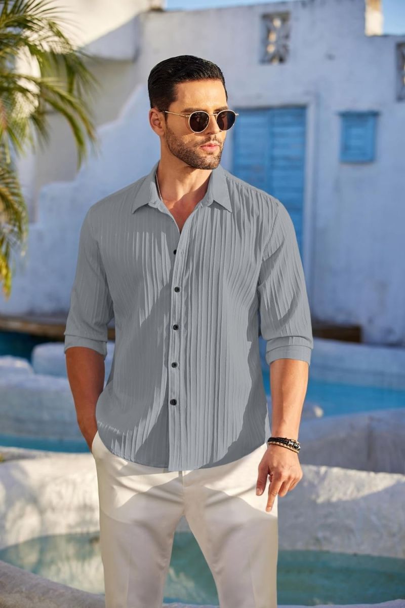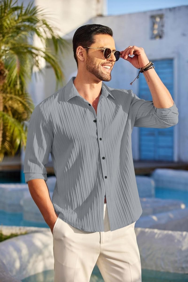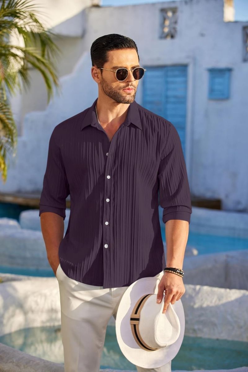 FINIVO FASHION Men's Casual Cotton Plain Button Down Shirt Long Sleeve Textured Summer Beach Shirt for Men
