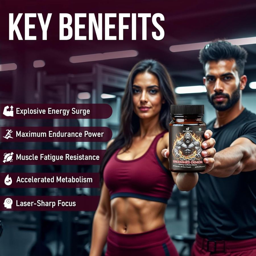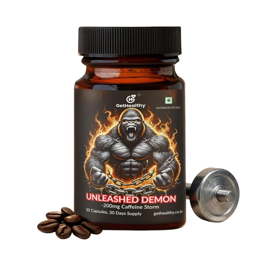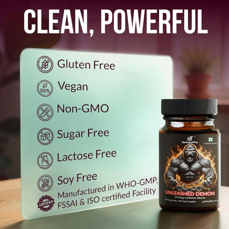 GetHealthy Unleashed Demon | Pre Workout for Men & Women | Potent Caffeine Pills with Niacin | Caffeine Capsules 200mg | 30 Day Vegan Supply
