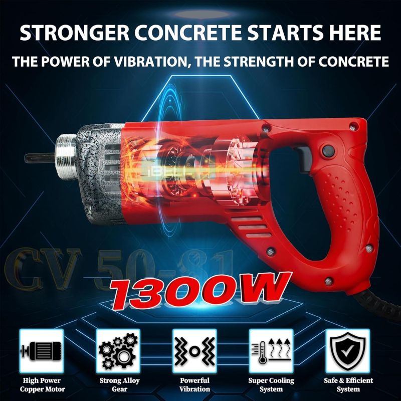 Concrete vibrator machine, electric concrete vibrator, portable cement vibrator, concrete vibrator with 1.5m rod, 1050W concrete vibrator, copper armature concrete vibrator, high speed 5000 RPM vibrator, 35mm needle vibrator for RCC, 150Hz vibration frequency tool, concrete vibrator with 0.9m amplitude, iBELL CV50-81 concrete vibrator, vibrator machine for slab and beam, construction compaction tool, cement needle vibrator 220V, heavy-duty concrete compactor