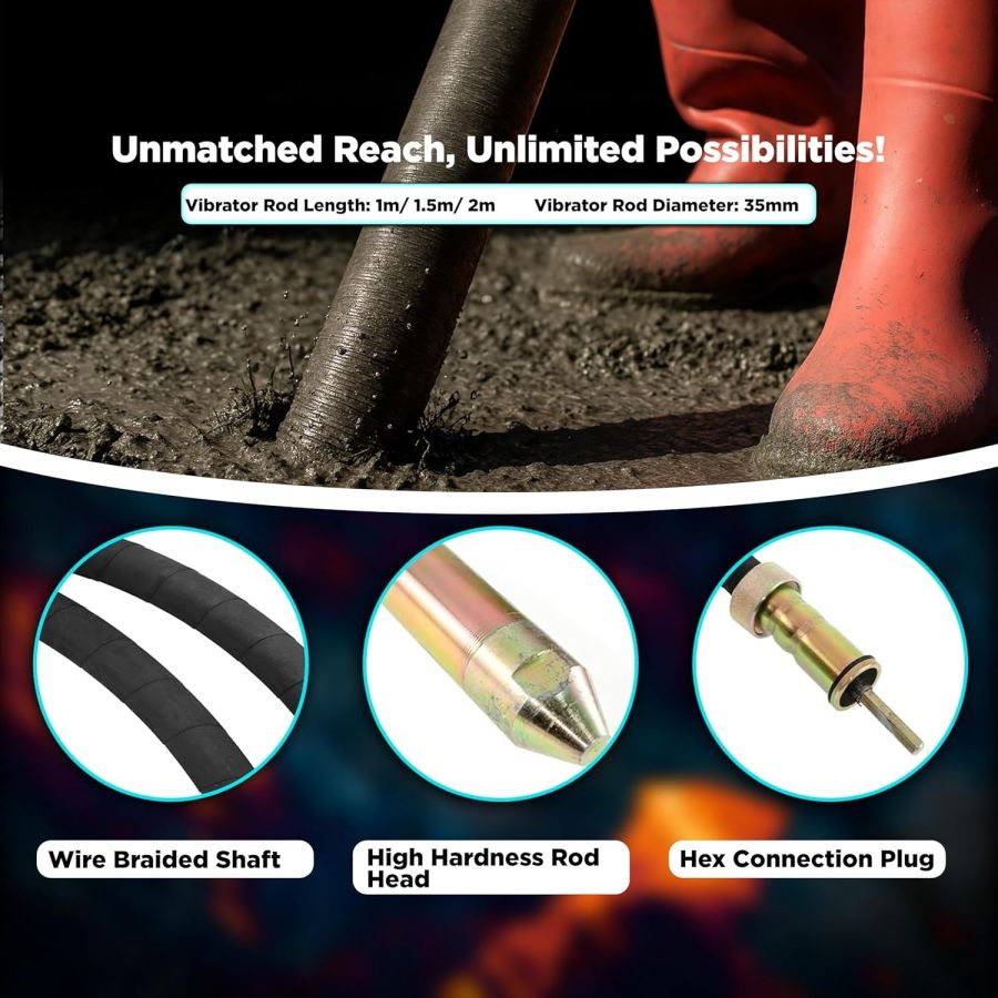 1.5M Vibrator Rod: Comes with a 35mm thick needle and 1.5-meter long rod ideal for deep concrete penetration in columns, beams, and slabs.