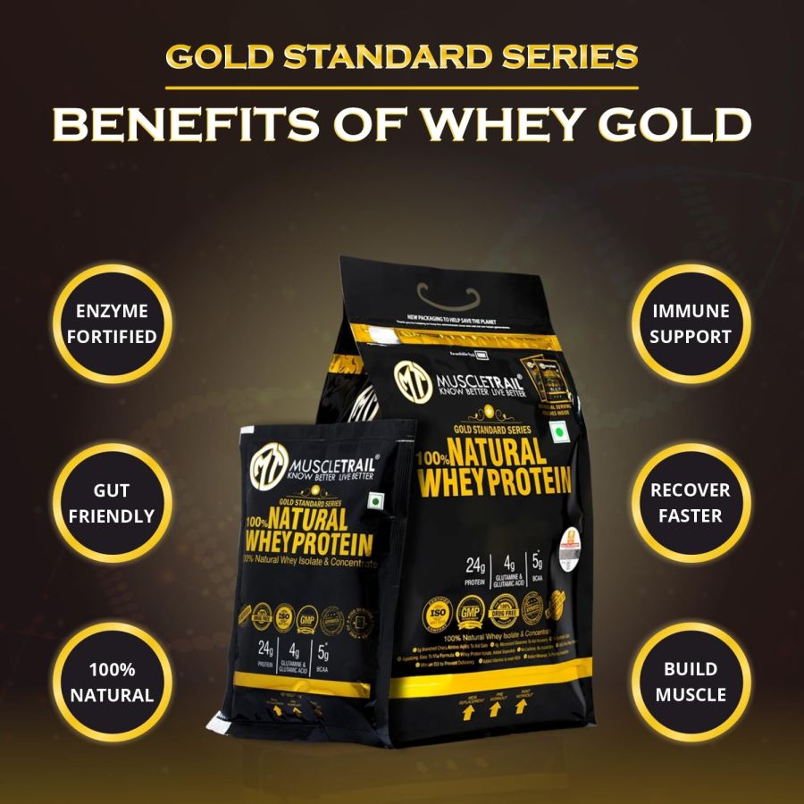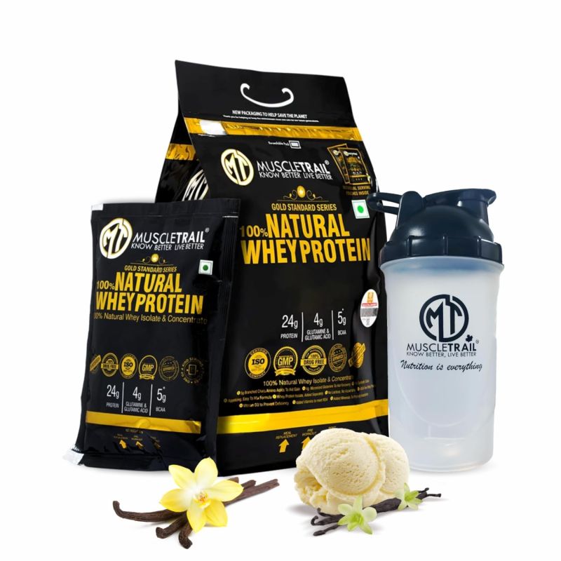 MuscleTrail Gold Standard Series, 60 Pouches, Low Carb & Fat, 24G Natural Whey Protein Powder, Shaker Inside (1.86Kg, Vanilla)