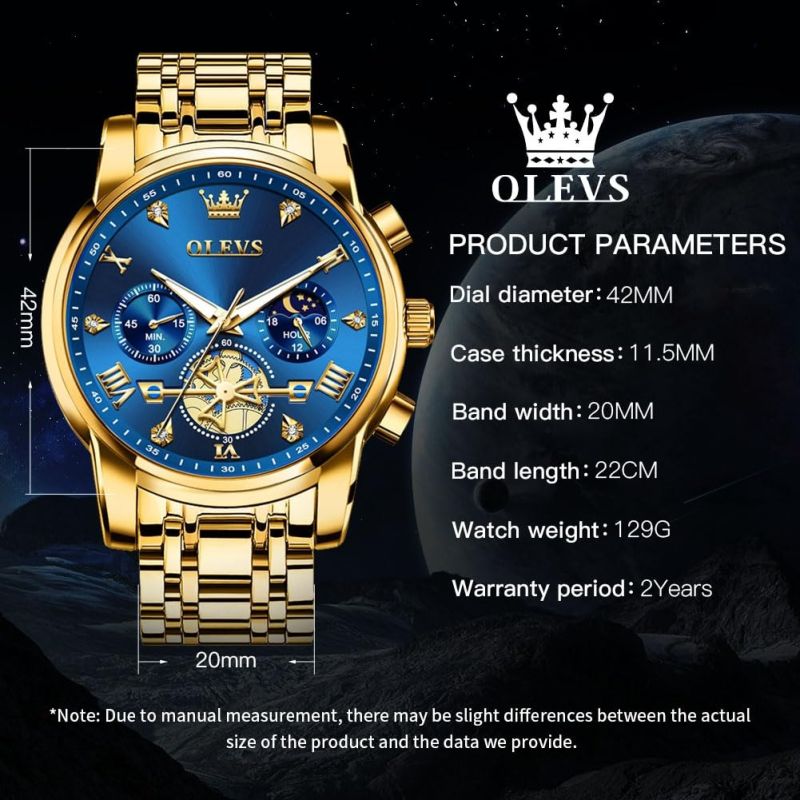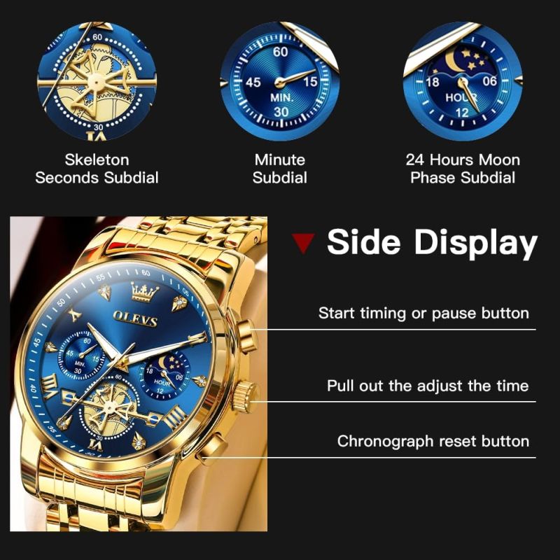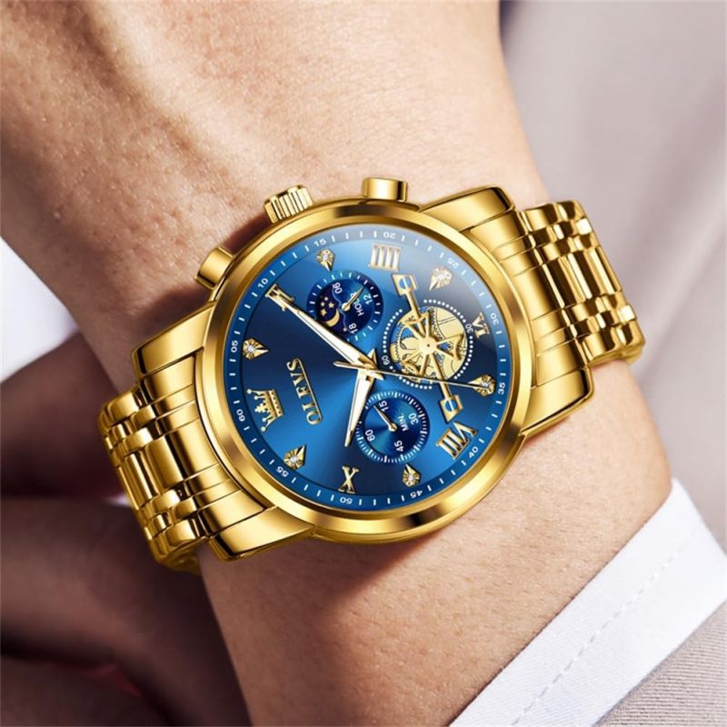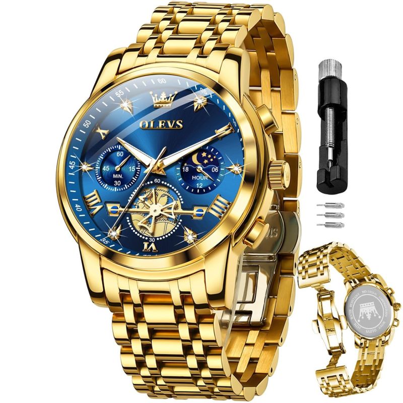 OLEVS Mens Chronograph Watch Gold Silver Stainless Steel Chain Quartz Wrist Watches Business Dress Waterproof Luminous Date Watch