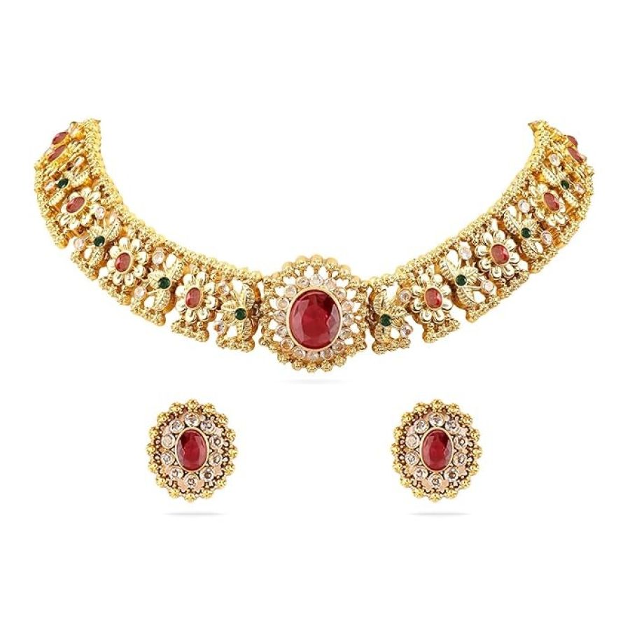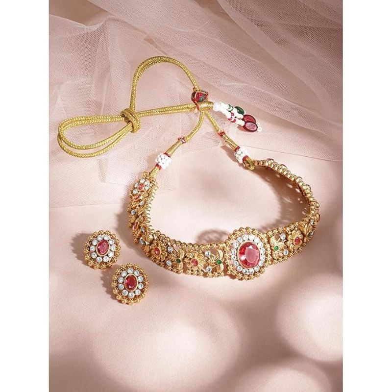 Exquisite Design: The floral choker set is plated in 24K gold, featuring intricate floral motifs with ruby red, emerald green, and white cubic zirconia studded details, creating a luxurious statement piece.
