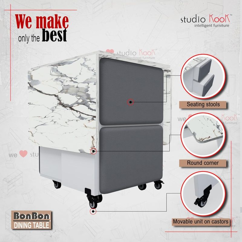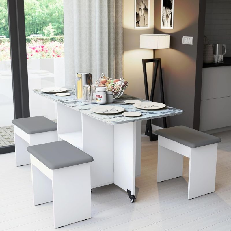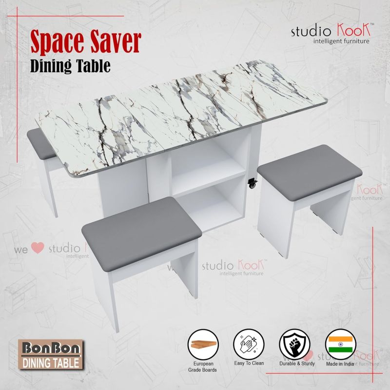Studio Kook Bonbon 4 Seater Folding Dining Table With Inbuilt Seating (Matte Finish, Marble Finish Laminate Top & Moonshine White) - Engineered Wood
