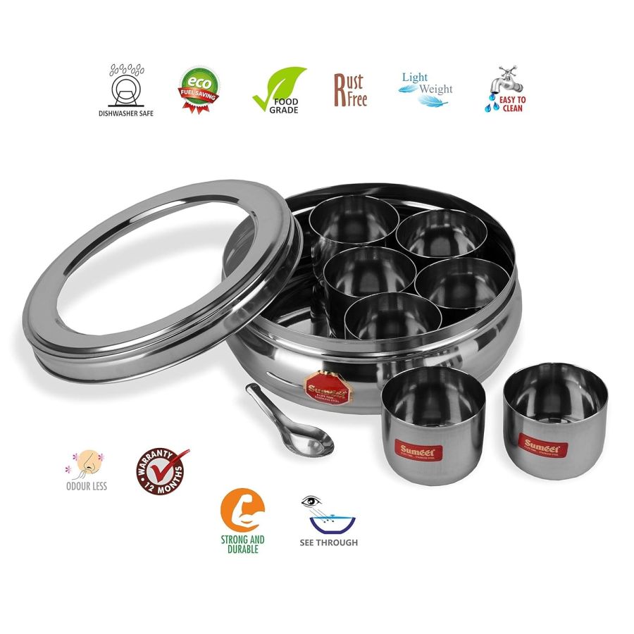 Sumeet Stainless Steel Belly Shape Masala (Spice) Box/Dabba/Organiser With See Through Lid With 7 Containers And Small Spoon (Small), Beige