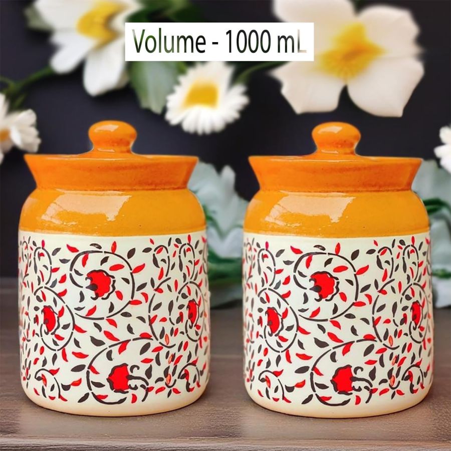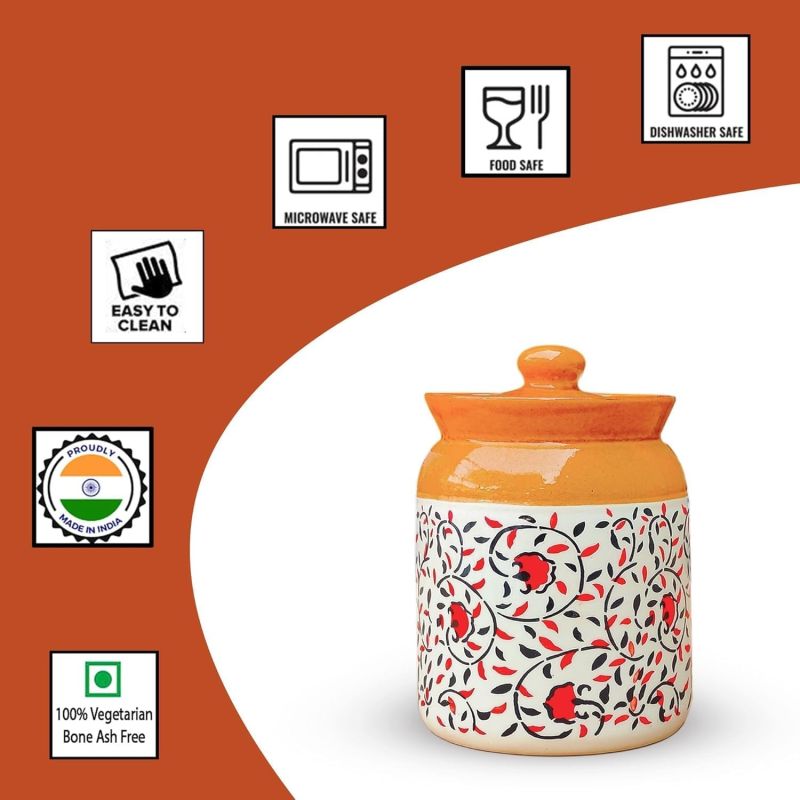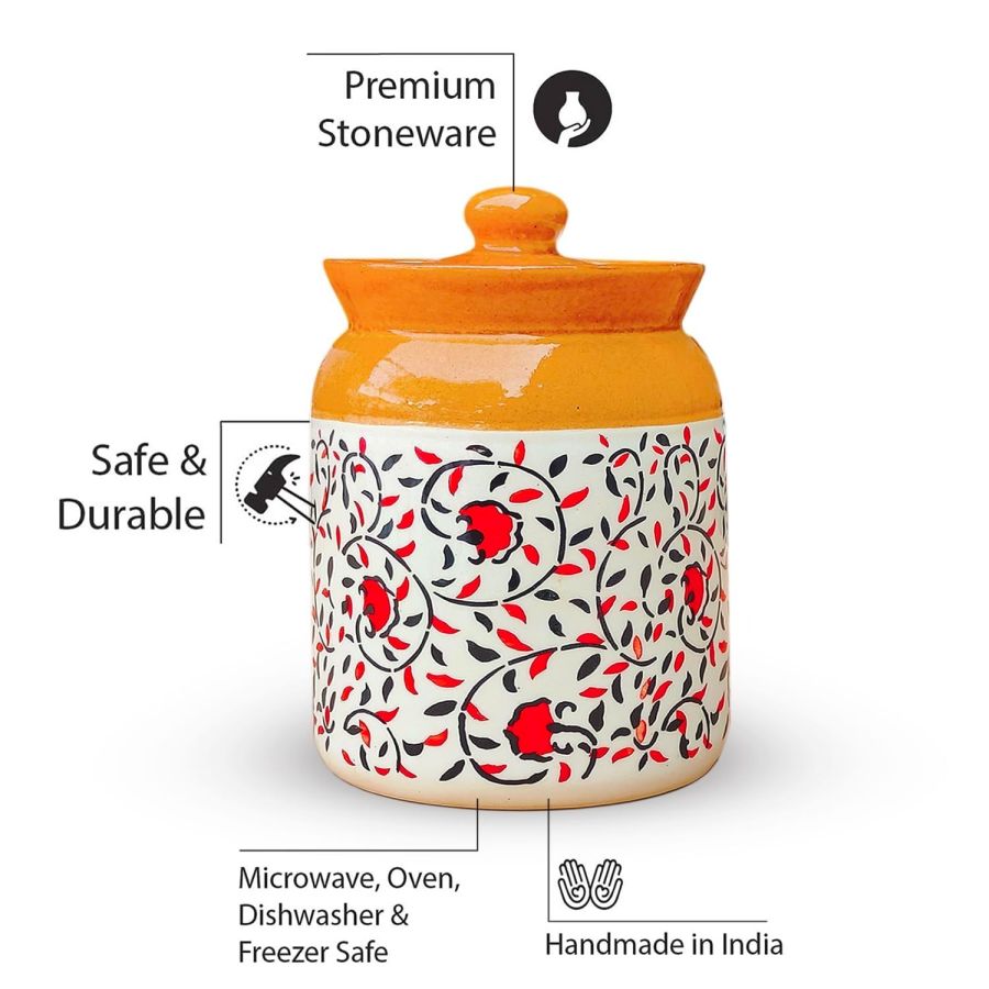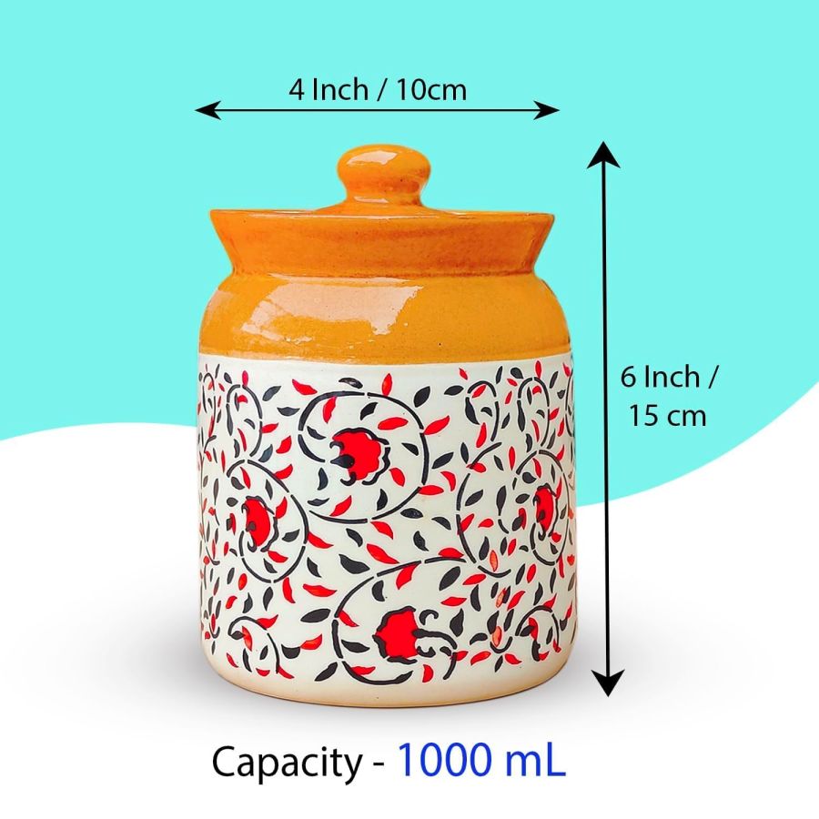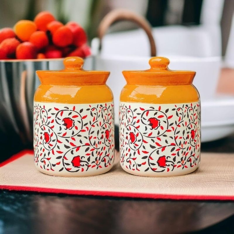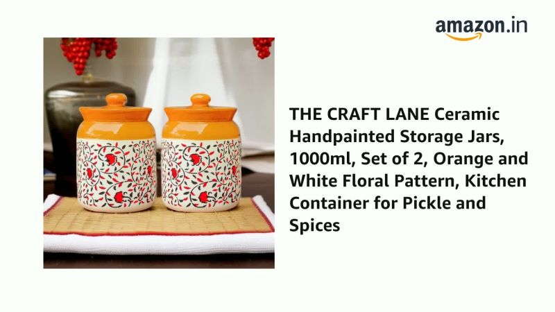 THE CRAFT LANE Ceramic Handpainted Storage Jars, 1000ml, Set of 2, Orange and White Floral Pattern, Kitchen Container for Pickle and Spices
