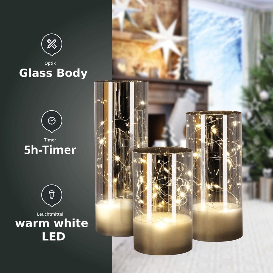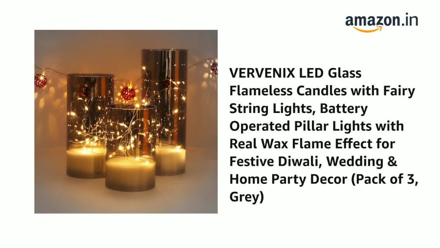 ???? Package Contains: Set of 3 LED Glass Candles with built-in fairy lights, pre-installed coin cell batteries, and a remote control for easy use.