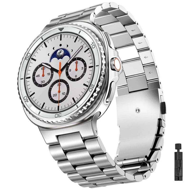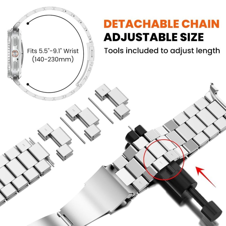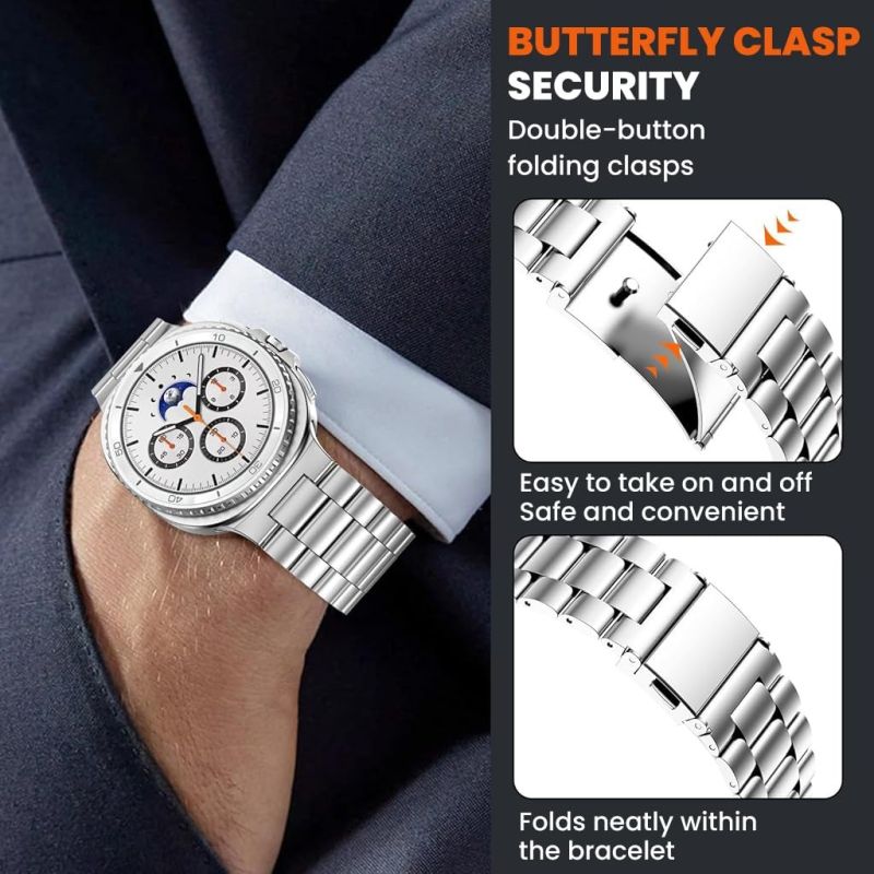 - PRECISE COMPATIBILITY: This stainless steel bracelet is precisely designed for the Galaxy Watch 8 and Galaxy Watch 8 Classic models, 46mm /44mm /40mm ensuring a seamless fit. Its tailored construction makes it the perfect accessory for enhancing both the style and functionality of your smartwatch while maintaining a secure and comfortable wear .
