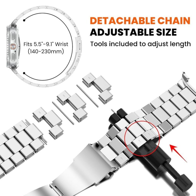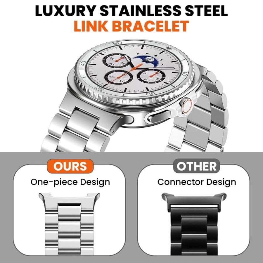 - LUXURY STAINLESS STEEL LINK BRACELET: Crafted from high-quality stainless steel in a polished silver finish, this watch band delivers a refined and luxurious look. The sleek metal links complement the smartwatchs modern style, offering durability, resistance to wear, and a timeless appearance.