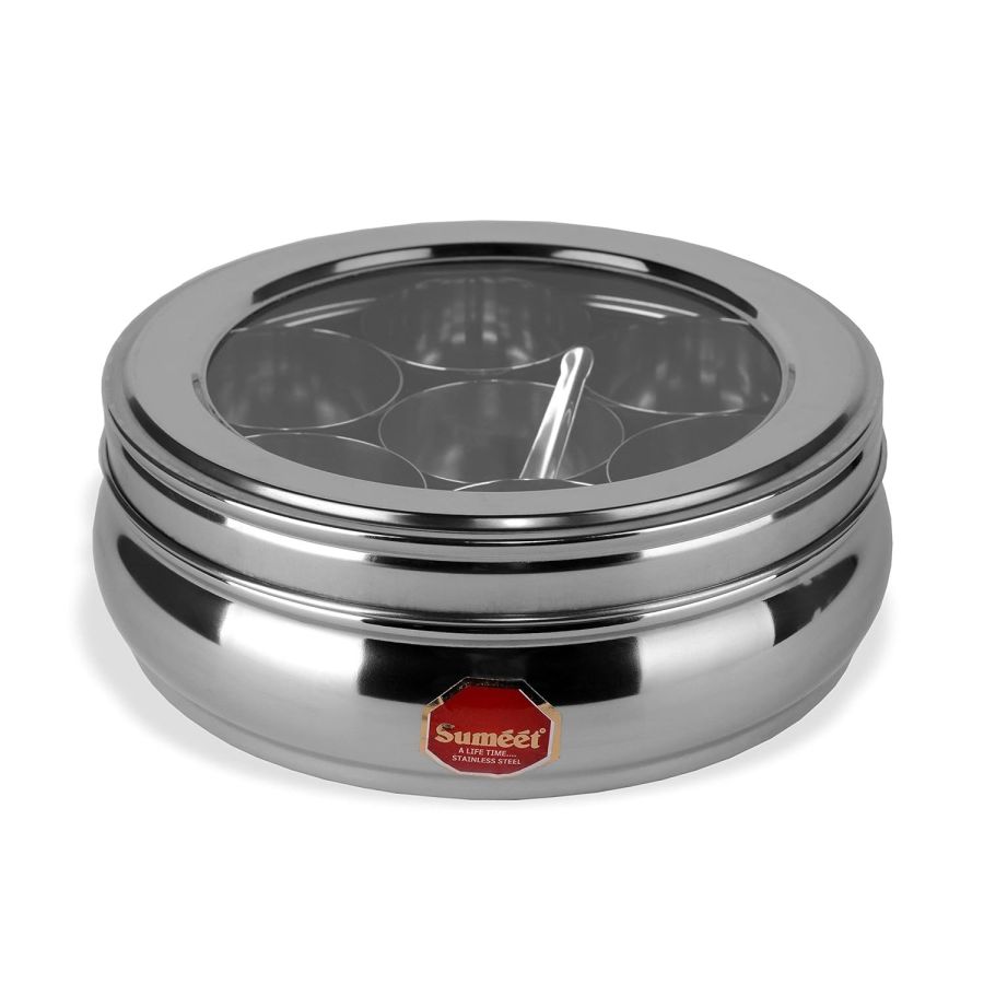 Sumeet Stainless Steel Belly Shape Masala (Spice) Box/Dabba/Organiser With See Through Lid With 7 Containers And Small Spoon (Small), Beige